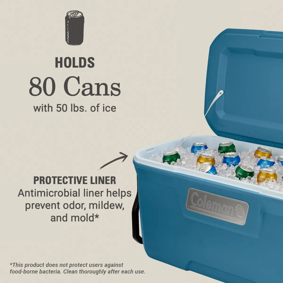 - 100qt volume holds up to 80 cans with an added 50lbs of ice