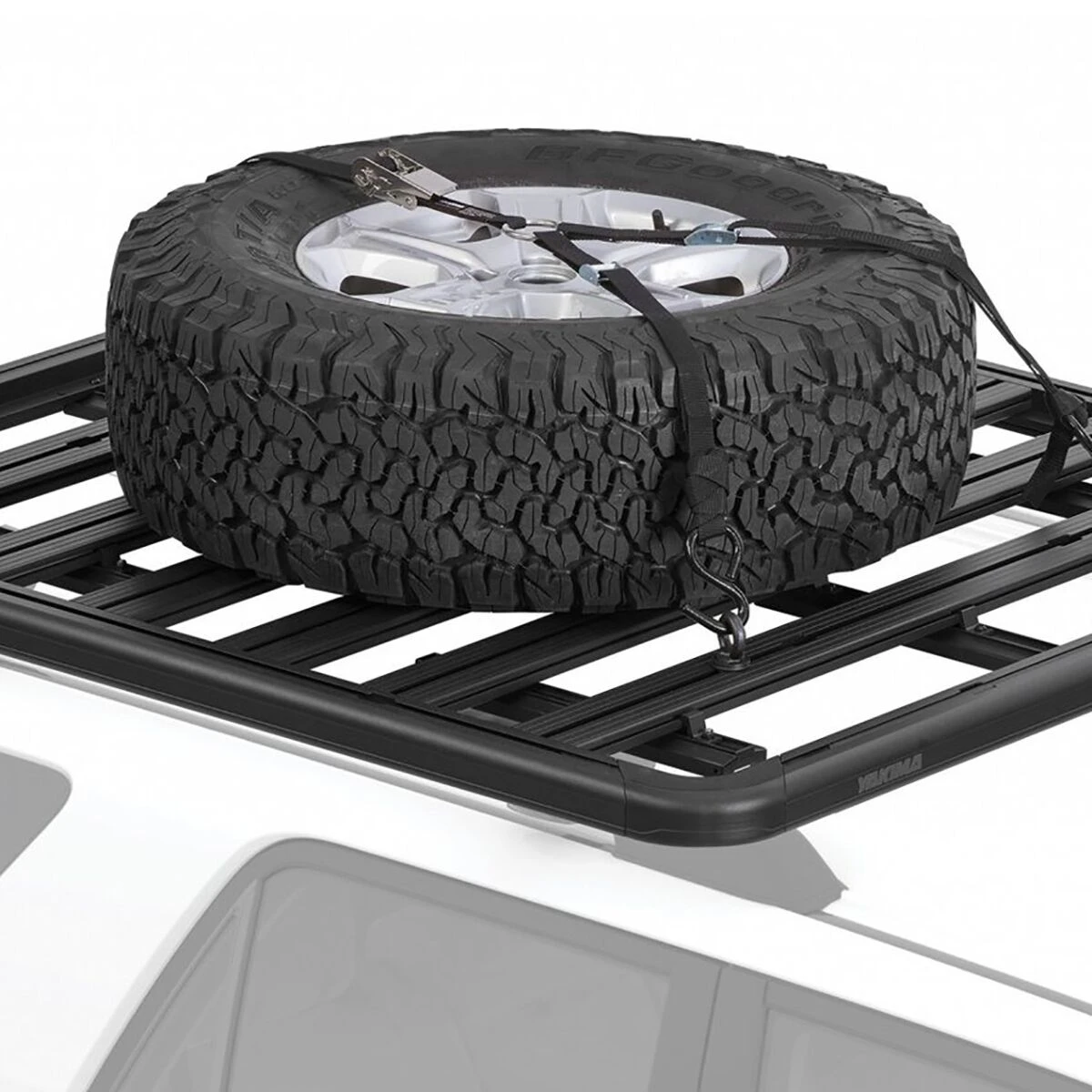 Dealing with a flat’s no problem when we secure a spare tire to the LockNLoad platform rack with this heavy-duty retention kit. The T-slot, drop-in style eyebolt hardware allows quick adjustment and removal, while sturdy stainless-steel ratchet straps take up the slack to hold most common size off-road tires in place for any adventure.